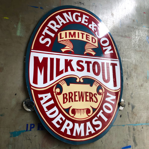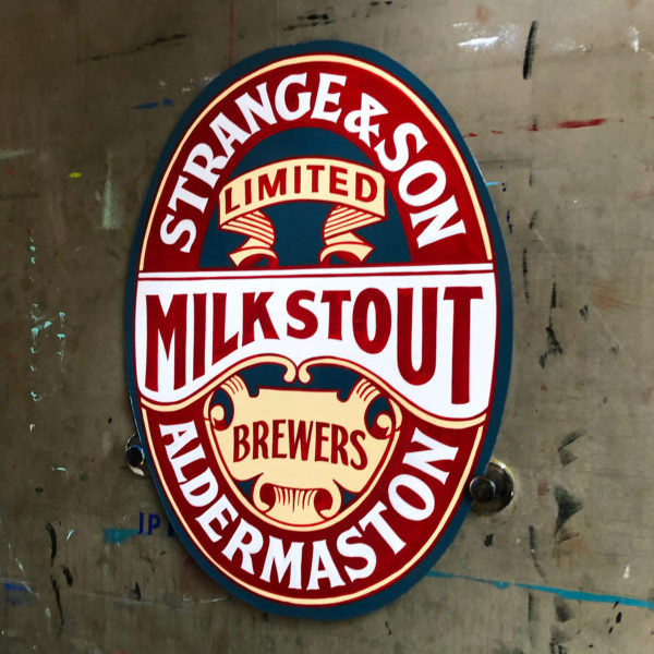 Insegna dipinta a mano con smalti su pannello di alluminio (serie ‘Etichette’), “Milk Stout” da soggetto storico