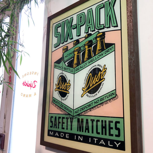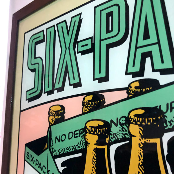 Soggetto originale dipinto a mano su vetro in cornice di legno smaltato (serie ‘Matchbox’), “Six-Pack” con confezione 6 bottiglie birra, testo: “SIX-PACK, Lust, Safety Matches”