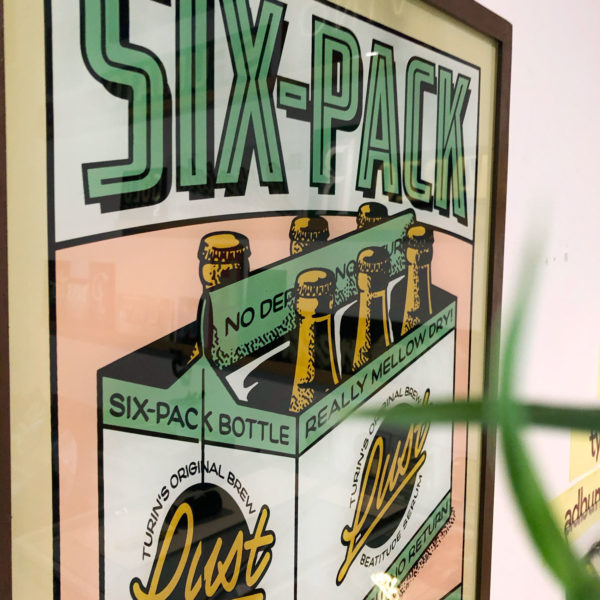 Original design hand painted on glass and framed (‘Matchbox’ series), “Six-Pack” featuring six-pack of beer bottles; Text: “SIX-PACK, Lust, Safety Matches”